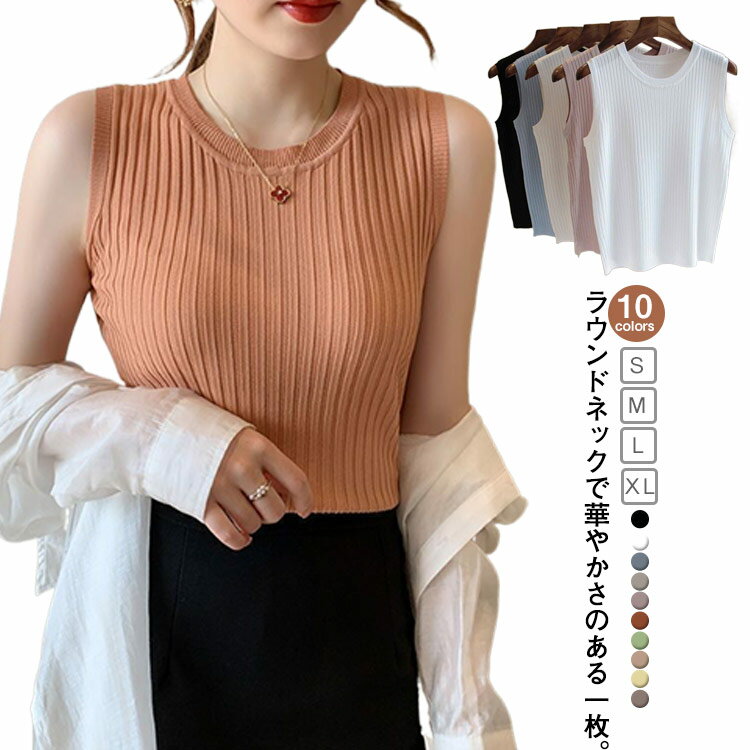 プリーツ タンクトップ レディース ラウンドãƒãƒƒã‚¯ Uãƒãƒƒã‚¯ ノースリーブ Tシャツ ニットトップス ストレッムトップス ラウンドãƒãƒƒã‚¯ãƒ‹ãƒƒãƒˆ レイヤード シンプル 春 å¤ å…¨10色 サマーニット