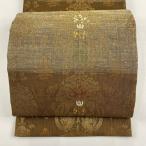 美品 袋帯 秀品 紬地 樹下鳥獣文 樹木 箔 茶緑色 六通 正絹 中古 在庫一掃