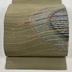 美品 名古屋帯 秀品 松葉仕立て 八寸名古屋帯 紬地 縞 幾何学模様 金銀糸 灰緑 正絹 中古 在庫一掃