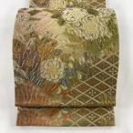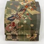 美品 袋帯 秀品 草花 花菱 金糸 箔 茶緑色 六通 正絹 中古 在庫一掃