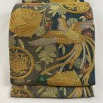 袋帯 美品 秀品 尾長鳥 糸巻き 箔 青緑 六通 正絹 中古 在庫一掃