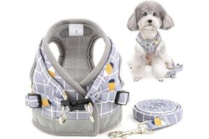 Zunea 犬 ハーネス リードセット 散歩 小型犬 ペット おしゃれ 可愛い ベスト 軽量 調節可能 胴輪 チェック柄 メッシュ ハーネス 猫用 反射テープ 安全 通気性 胸あて式 引っ張り防止 犬服 夏 簡単着脱 グレー L